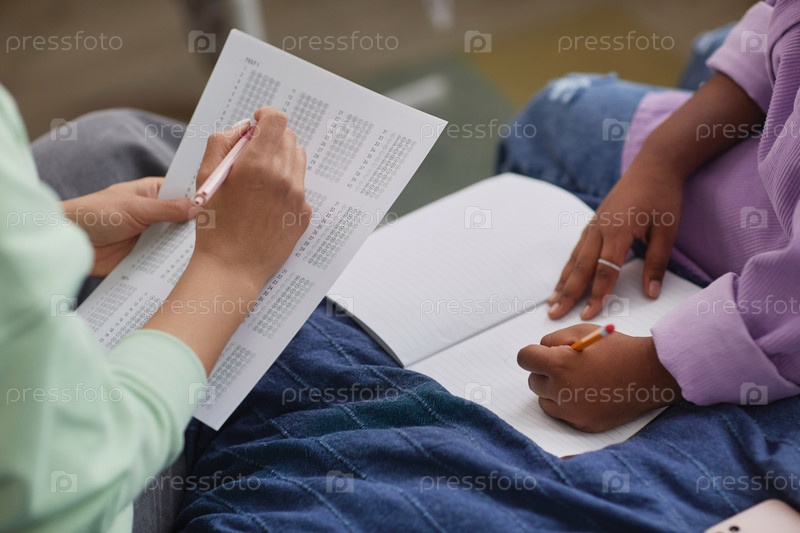 Близкий план матери, помогающей дочери с домашними заданиями в помещении