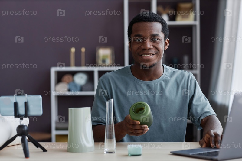 Счастливый молодой ремесленник с ручной вазой в руке, смотрящий на камеру