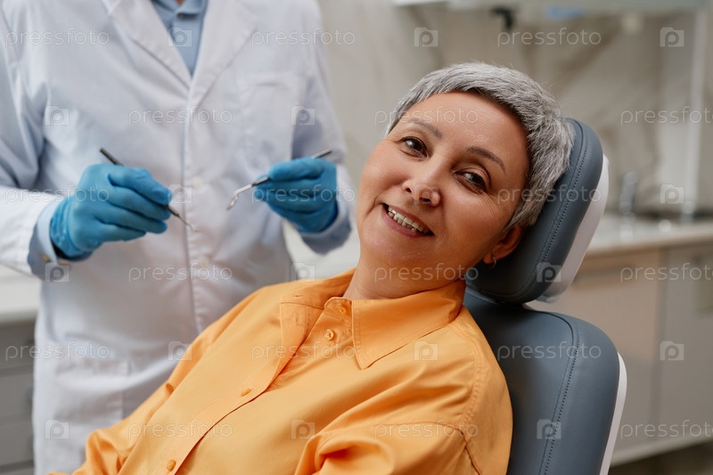 Улыбающаяся старшая женщина в стоматологической клинике сидит на стуле и смотрит в камеру