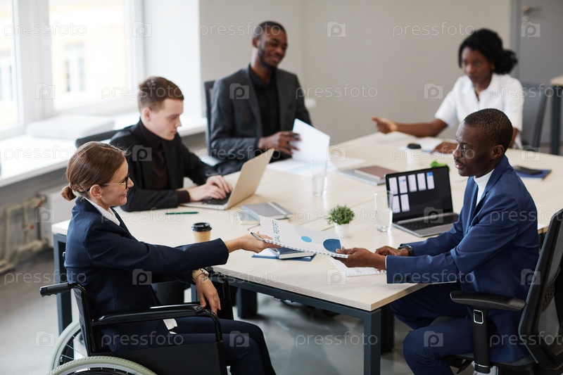 Деловая женщина, использующая инвалидное кресло на совещании