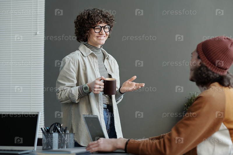 Молодая жизнерадостная деловая женщина за чашкой кофе разговаривает с коллегой