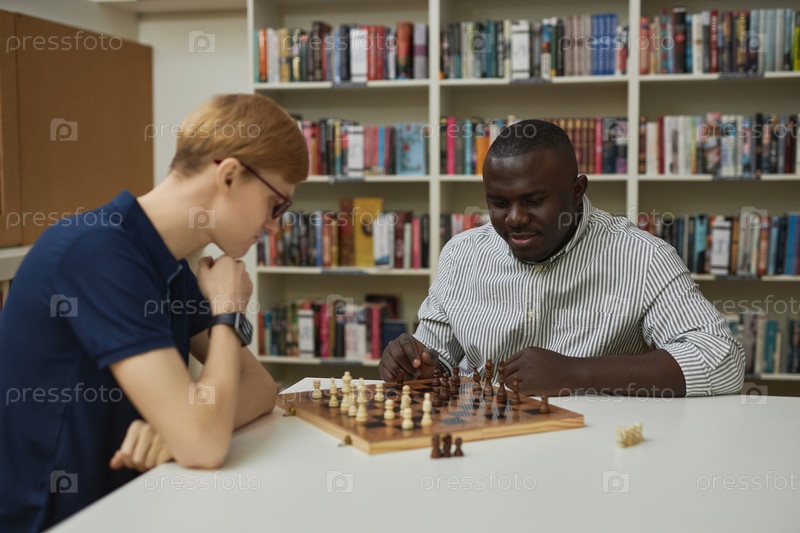Два человека играют в шахматы в библиотеке с чернокожим человеком, думающим о стратегии победы