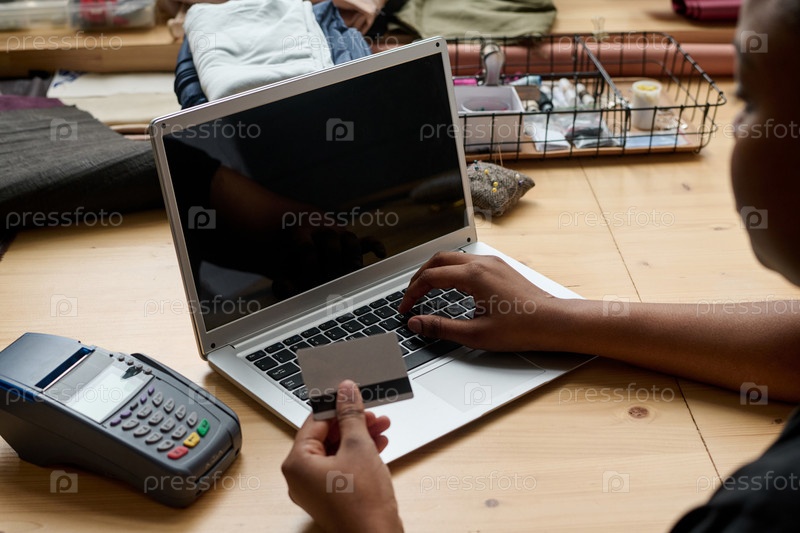 Рука молодой афроамериканской женщины с кредитной картой на клавиатуре ноутбука