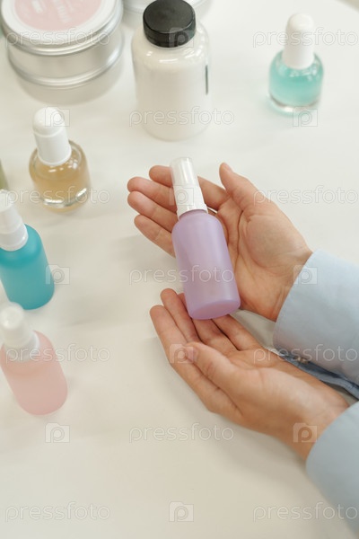 Руки молодой покупательницы, держащей пластиковую бутылку с косметическим продуктом