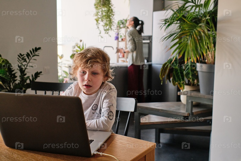 Маленький мальчик, использующий ноутбук дома