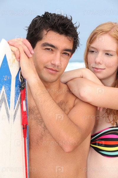 Молодая пара на пляже с доской для серфинга