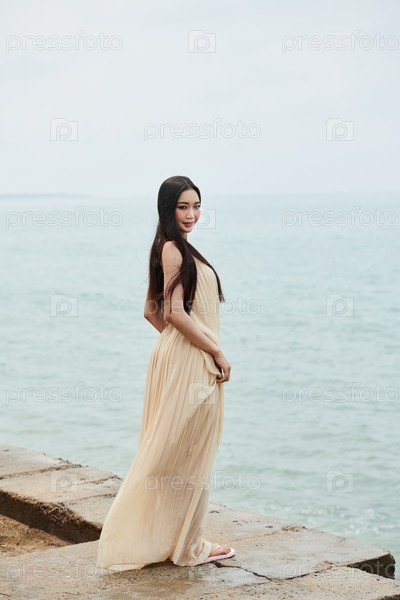 Молодая женщина стоит на пляже