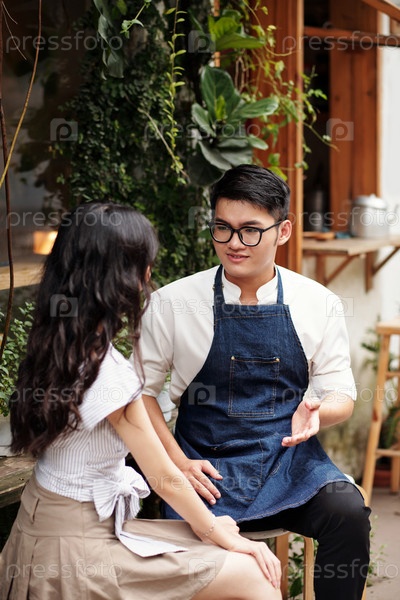 Владелец кофейни разговаривает с девушкой