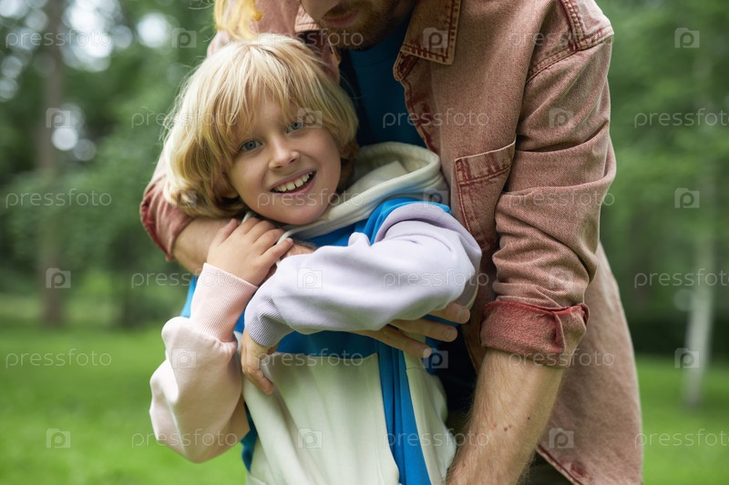 Счастливый блондин сближается со своим отцом в парке и смотрит на камеру