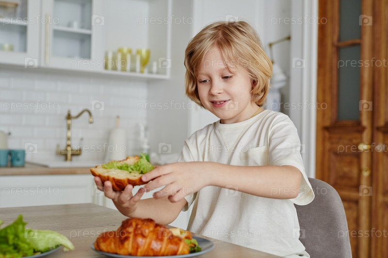 Улыбающийся мальчик ест бутерброд дома