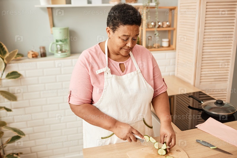 Чернокожая старшая женщина режет овощи