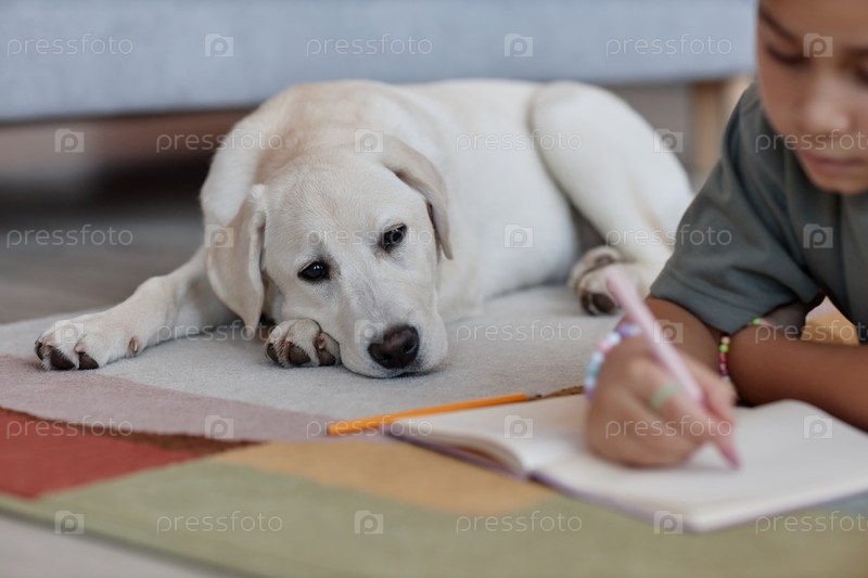 Милый сонный щенок, лежащий на полу дома и ожидающий домашних животных