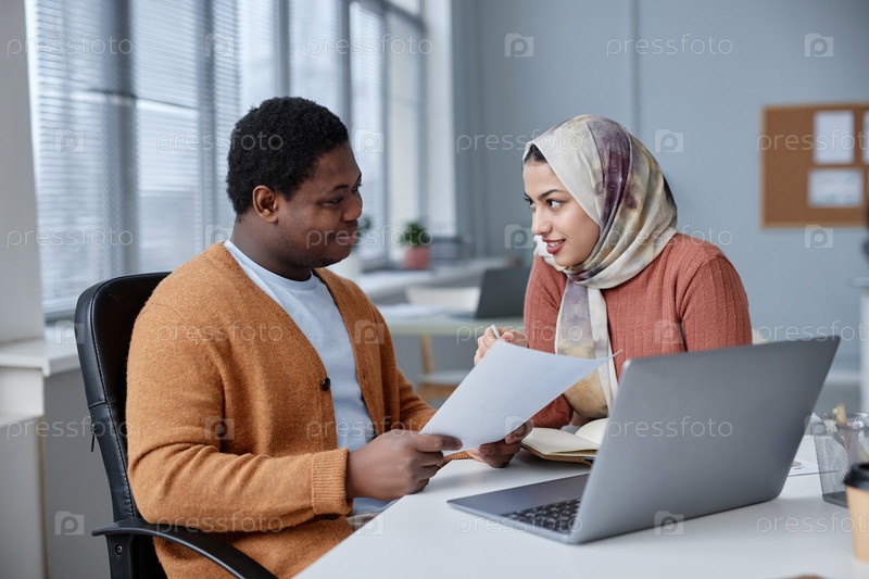 Уверенная в себе деловая женщина с платками объясняет финансовые данные коллеге