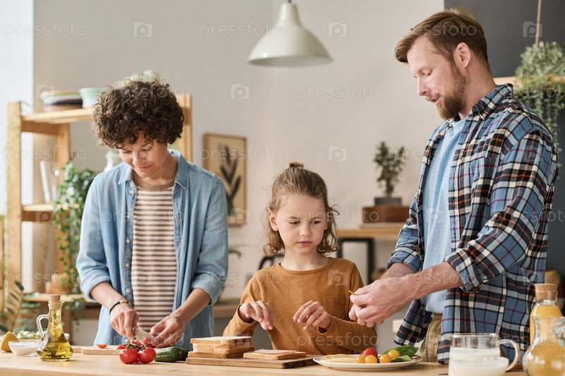 Семья готовит ужин вместе дома