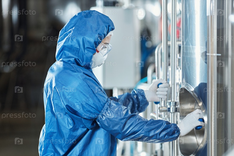 Работница, одетая в защитное снаряжение и использующая оборудование на химической фабрике