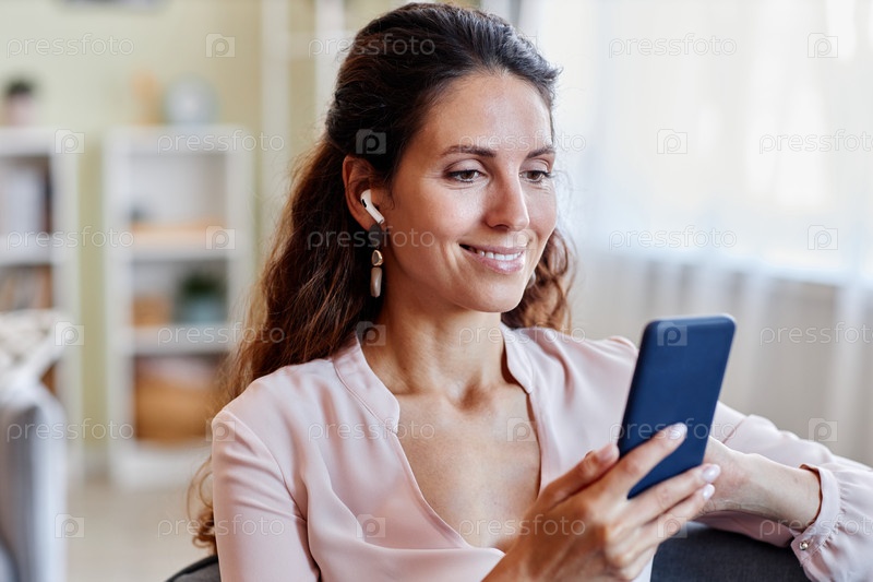 Элегантная женщина, использующая мобильный телефон в помещении с улыбкой