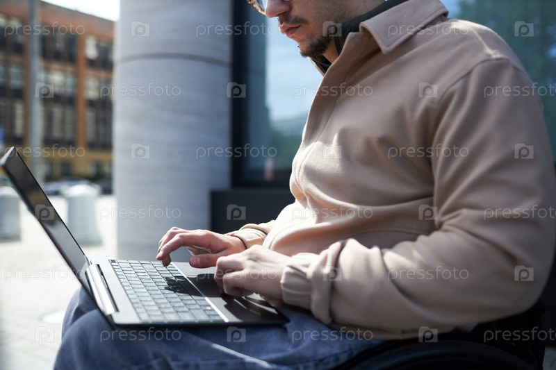 Мужчина работает онлайн на ноутбуке на открытом воздухе