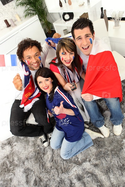 Группа друзей поддерживает сборную Франции по футболу