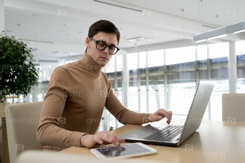 Молодой серьезный высокотехнологичный разработчик, использующий планшет и ноутбук