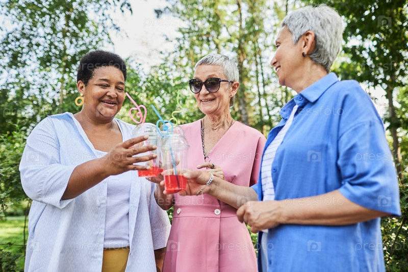 Пожилые женщины наслаждаются напитками на открытом воздухе в парке и весело улыбаются