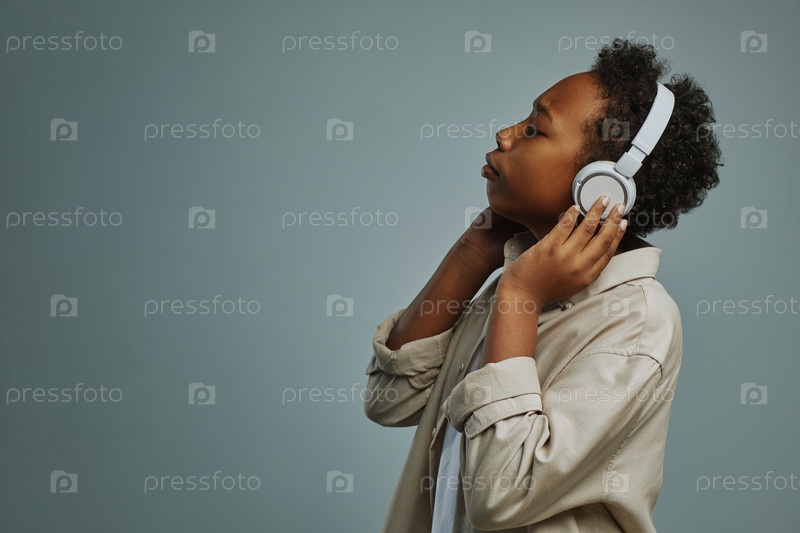 Очаровательный мальчик до подросткового возраста в обычной рубашке наслаждается своей любимой музыкой