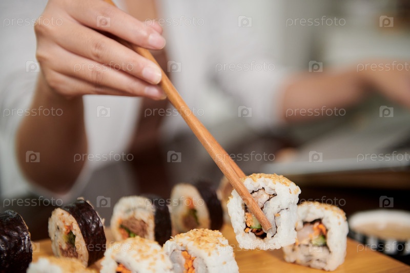 Женщина ест суши с палочками