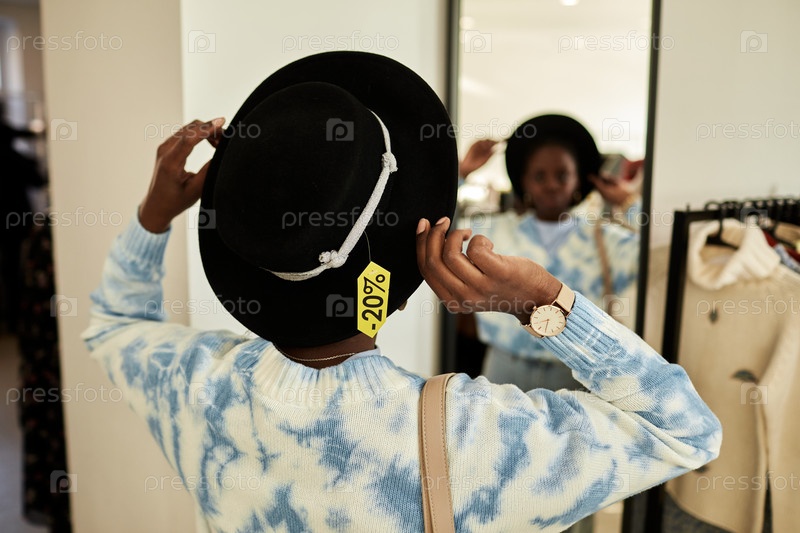 Молодая чернокожая женщина пытается надеть шляпу в магазине подержанных товаров