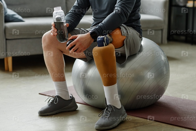 Непризнанный мужчина с протезированной ногой в домашней тренировке