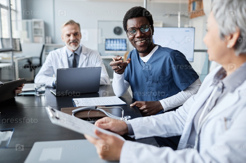 Счастливая молодая афроамериканская ассистентка в форме смотрит на зрелую женщину