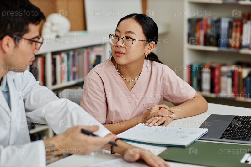 Молодая азиатская женщина в качестве студента-медика разговаривает с другом или коллегой по работе на семинаре