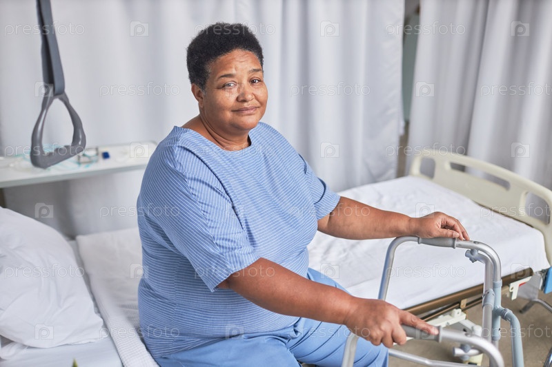 Афроамериканская пожилая женщина смотрит на камеру в больничной комнате