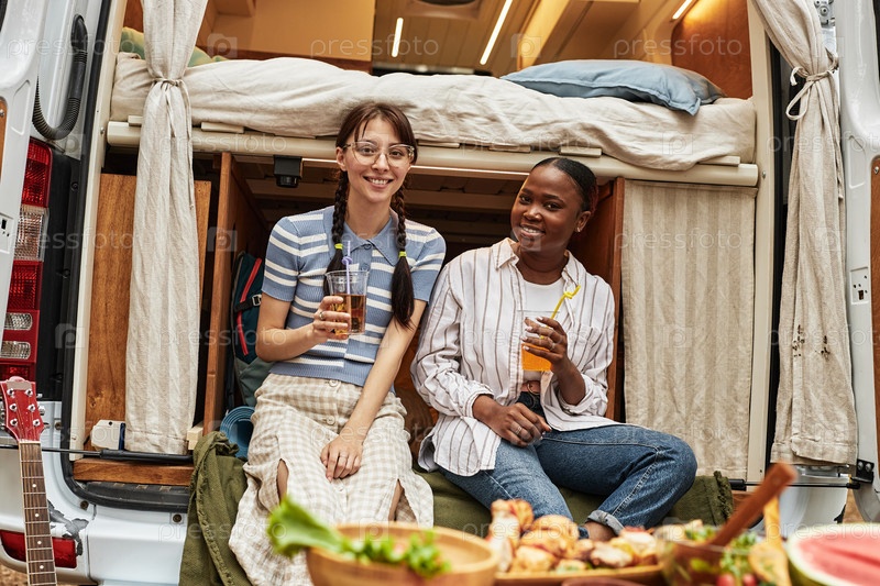 Девушки пьют коктейли на пикнике