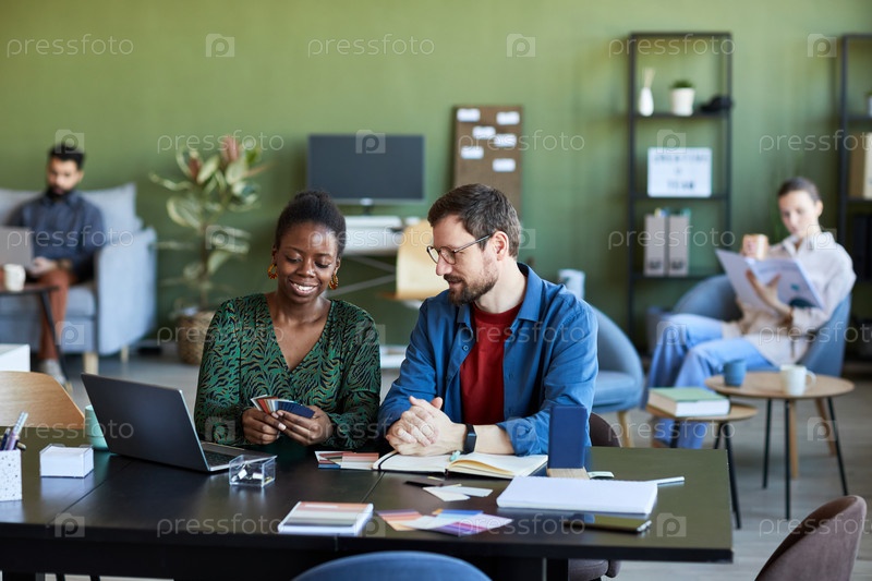 Счастливая молодая дизайнерка показывает цветовую палитру своему коллеге-мужчине