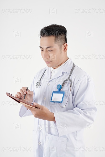 Врач делает заметки на планшете