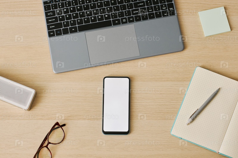 Минимальный смартфон верхнего вида с макетом белого экрана на рабочем столе