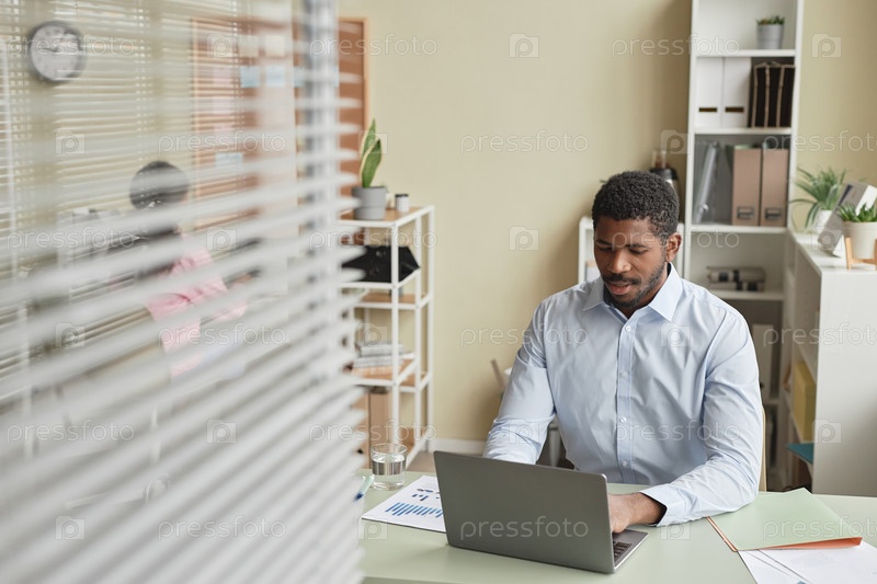 Чернокожий бизнесмен использует компьютер за своим столом