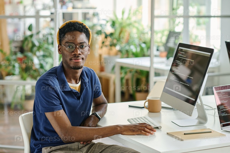 Молодой разработчик сидит на своем рабочем месте