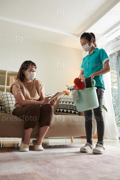Woman rating work of cleaning serivce worker Работа в службе уборки