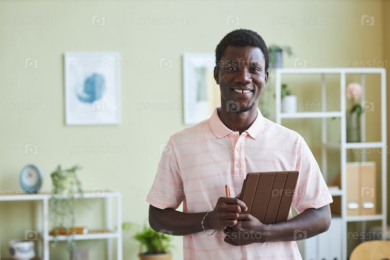 Чернокожий мужчина, улыбающийся на камеру, стоит в офисе и держит планшет