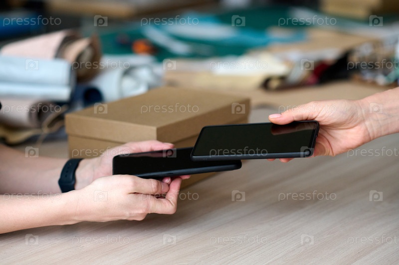 Близкий снимок руки покупателя, держащего смартфон над рукой продавца
