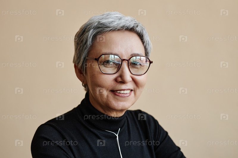 Старшая азиатская женщина в очках смотрит на камеру