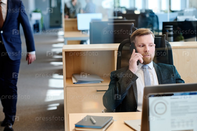 Менеджер разговаривает по телефону на рабочем месте