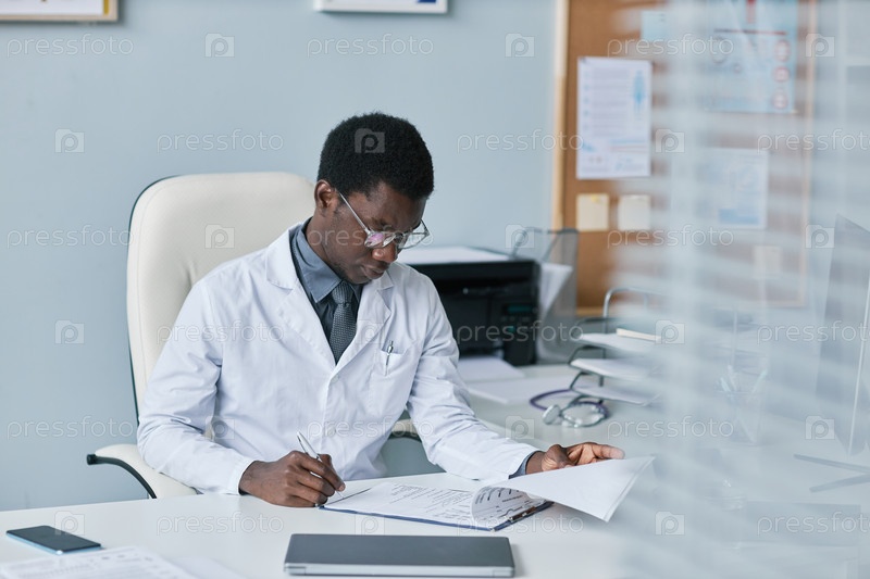 Молодой чернокожий врач заполняет бумаги за столом в офисе, работает в клинике