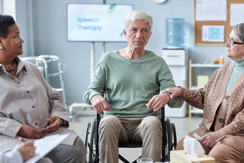 Пожилой мужчина с инвалидностью делится своими чувствами в кругу группы поддержки