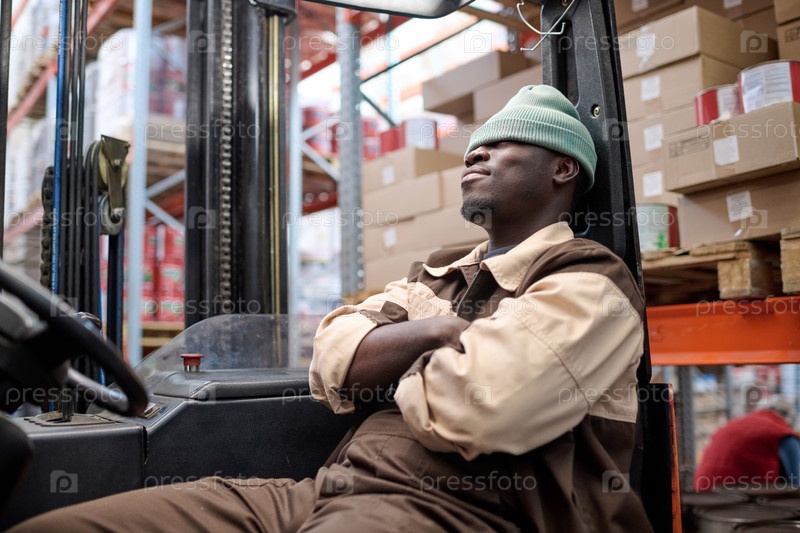 Водитель вилочного погрузчика делает перерыв