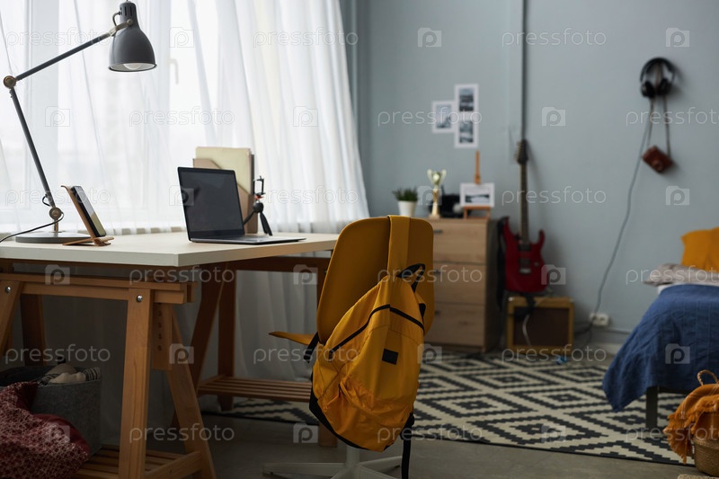 Стул с желтым рюкзаком стоит перед столом со лампой и ноутбуком