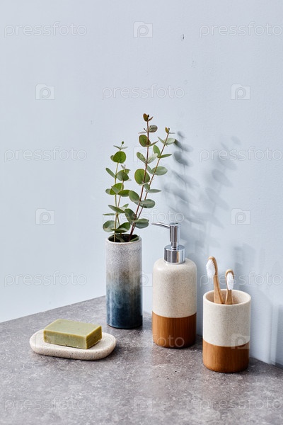 Туалетные принадлежности в дизайнерских контейнерах на туалетном столе