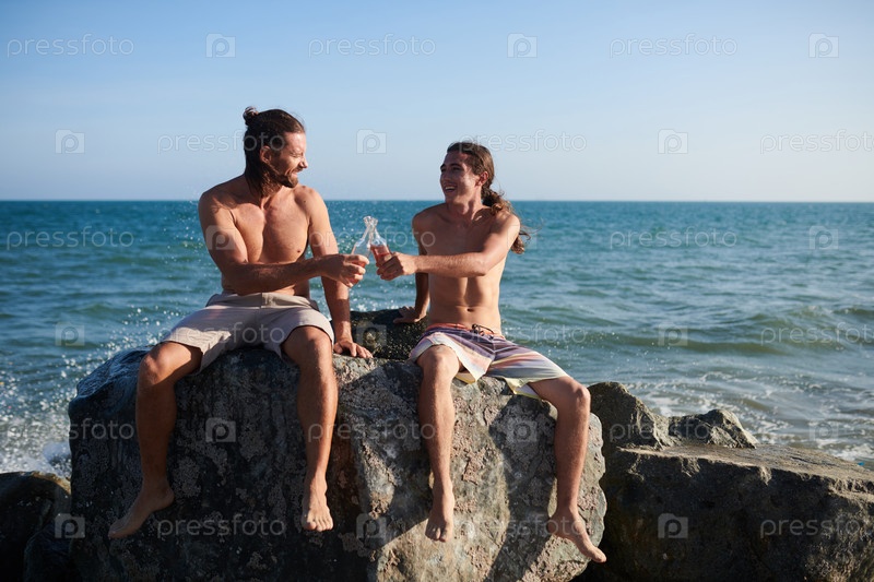 Молодые мужчины пьют напитки на пляже