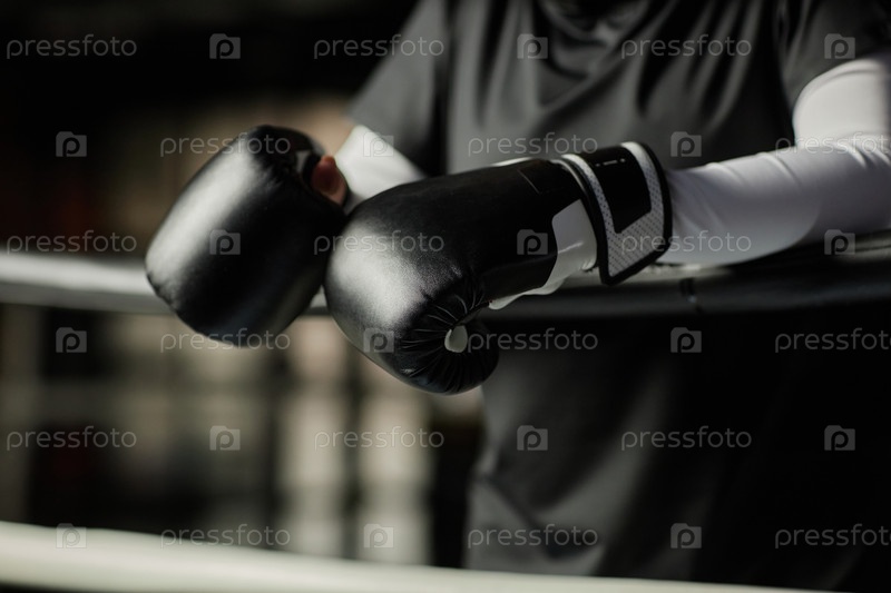 Близкий план молодой женщины-боксера в боксерских перчатках, стоящей на арене во время перерыва
