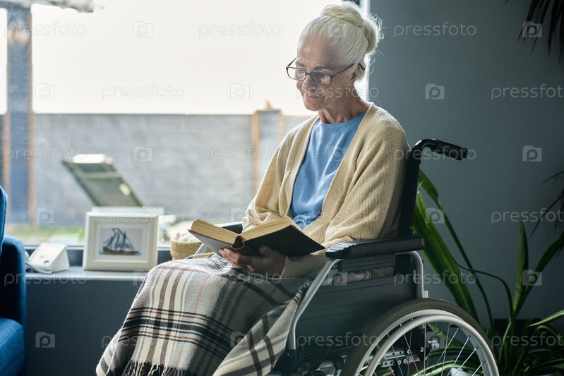 Пожилая женщина-инвалид сидит в инвалидной коляске и читает книгу